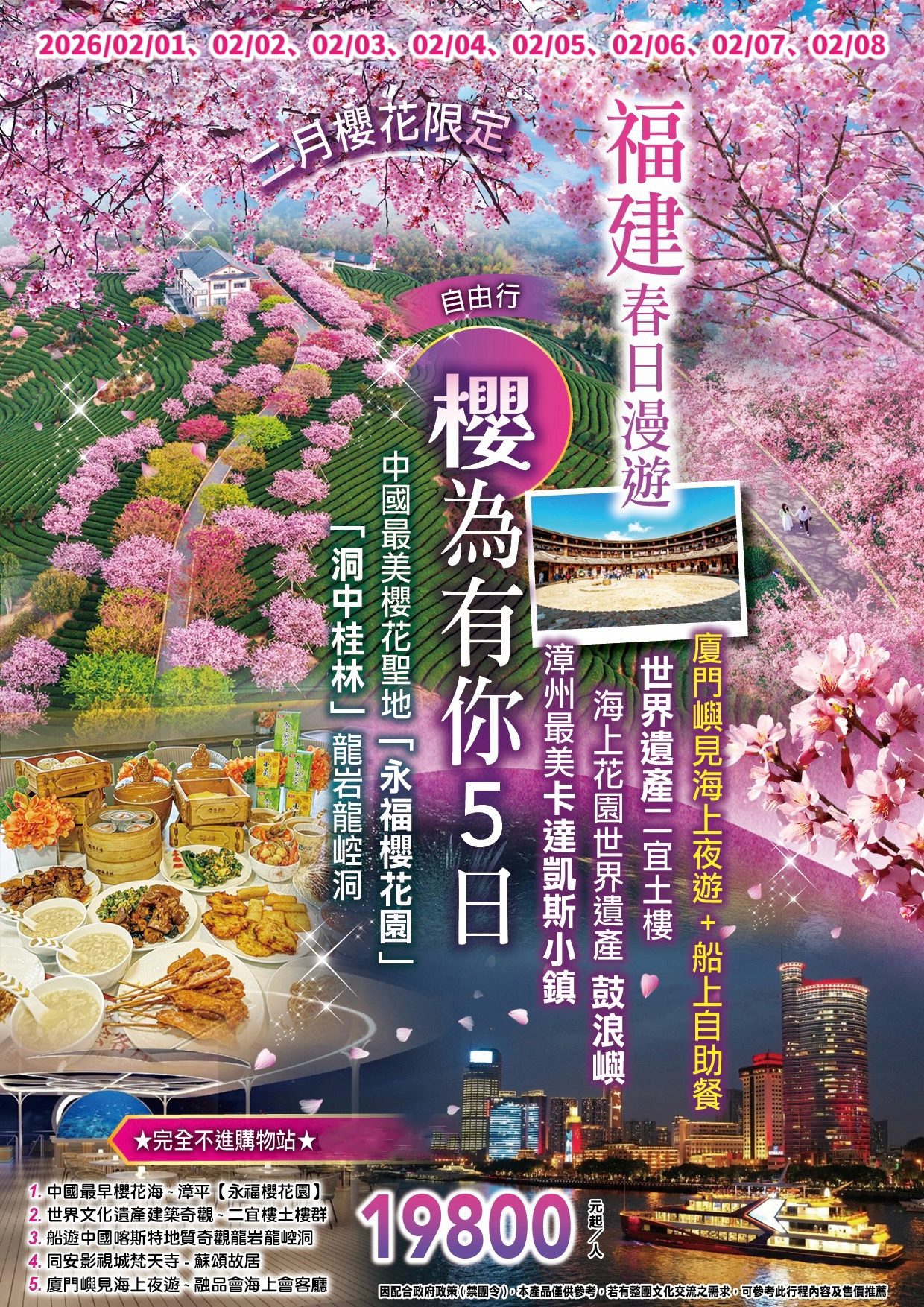 中國最美櫻花聖地「永福櫻花園」、「洞中桂林」龍岩龍崆洞、廈門嶼見海上夜遊+船上自助餐、世界文化遺產二宜樓「土樓之王」、漳州西班牙風情—最美卡達凱斯小鎮